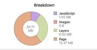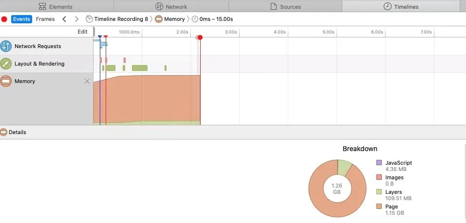 If you open in Safari a normal webpage, for example: https://apple.com which is a webpage with images, javascript, animations, video, etc. The Safari Timeline inspector says the memory usage is around 205MB