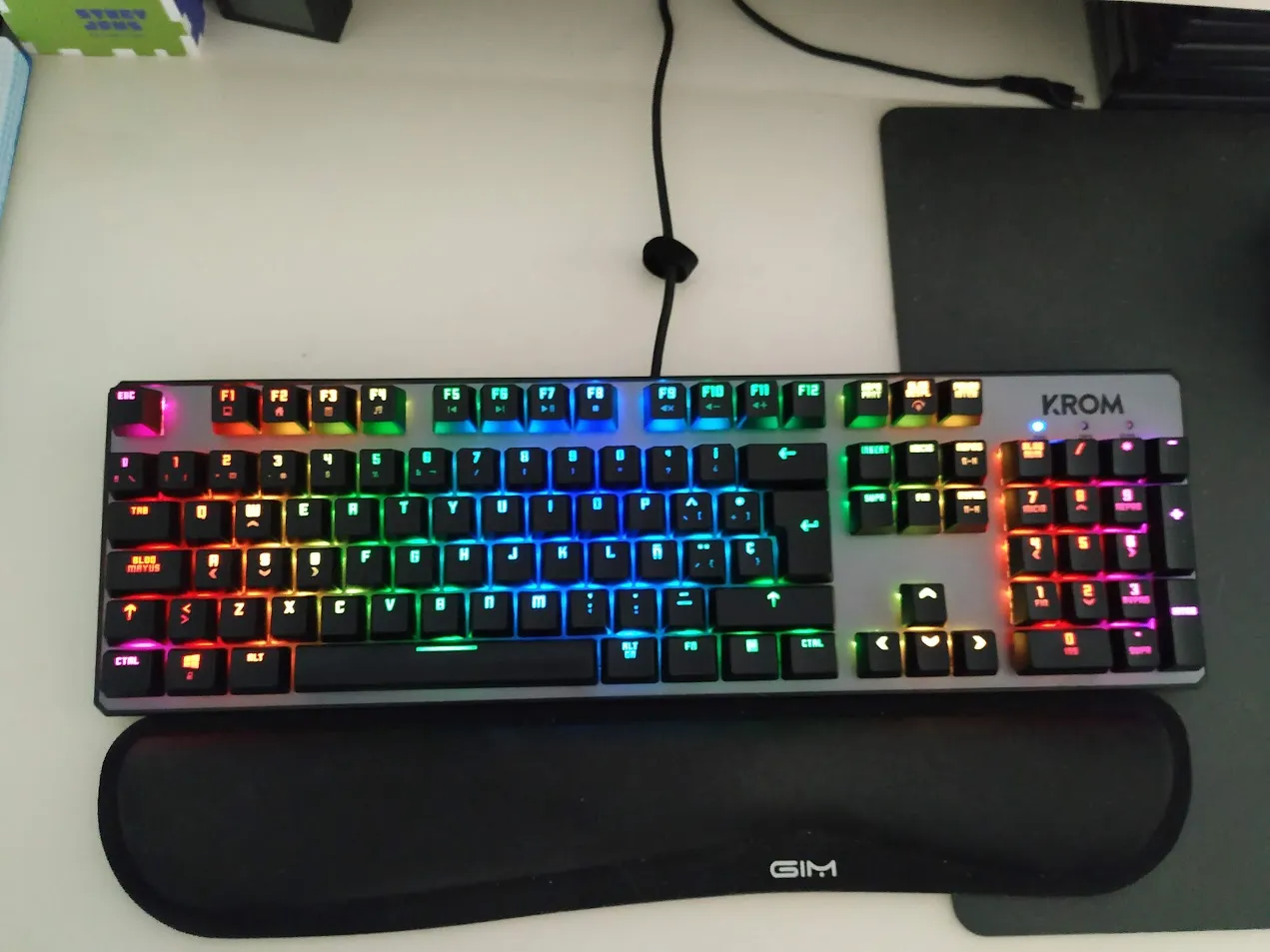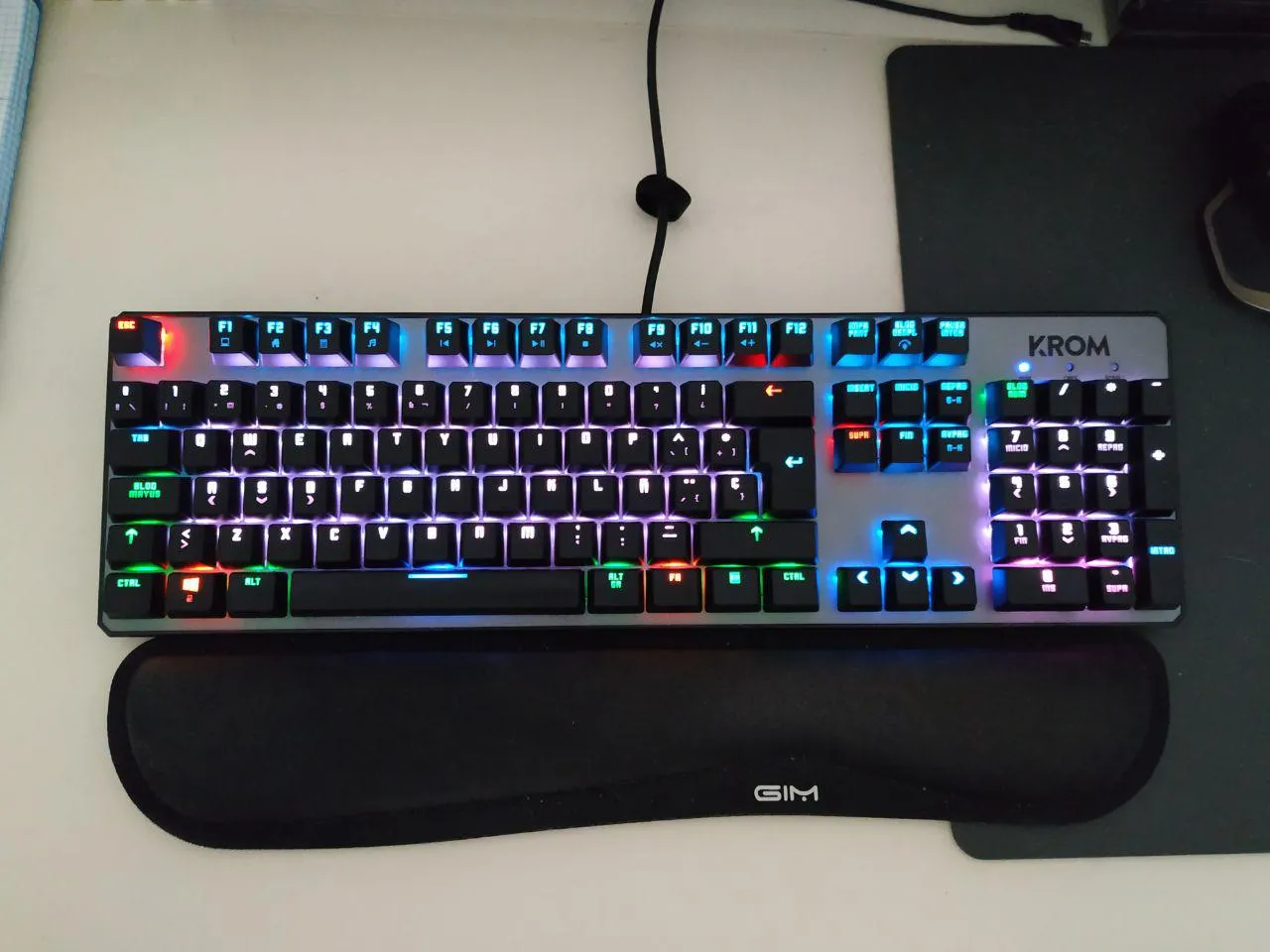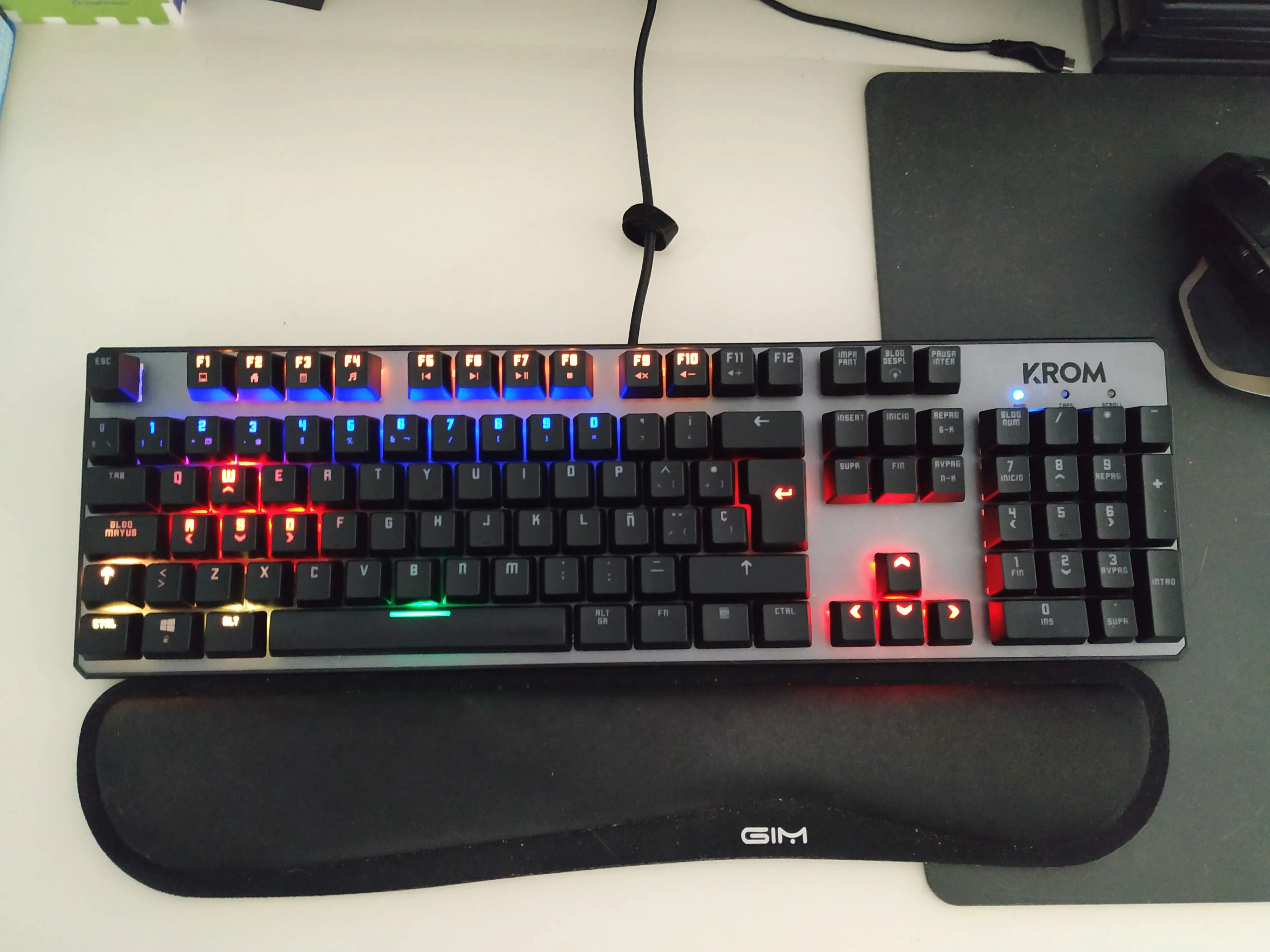 Finalmente el escogido ha sido el que ves en la foto superior, el Krom Kernel un teclado mecánico con switches Outemu Red, unos clones de los Cherry Mx Red y con iluminación RGB configurable desde el propio teclado (sin software externo) que cuesta actualmente unos 55€ en Amazon y del que además tienes una versión sin teclado numérico (las llamadas TLK, Ten Key Less) por un poco menos (50€)