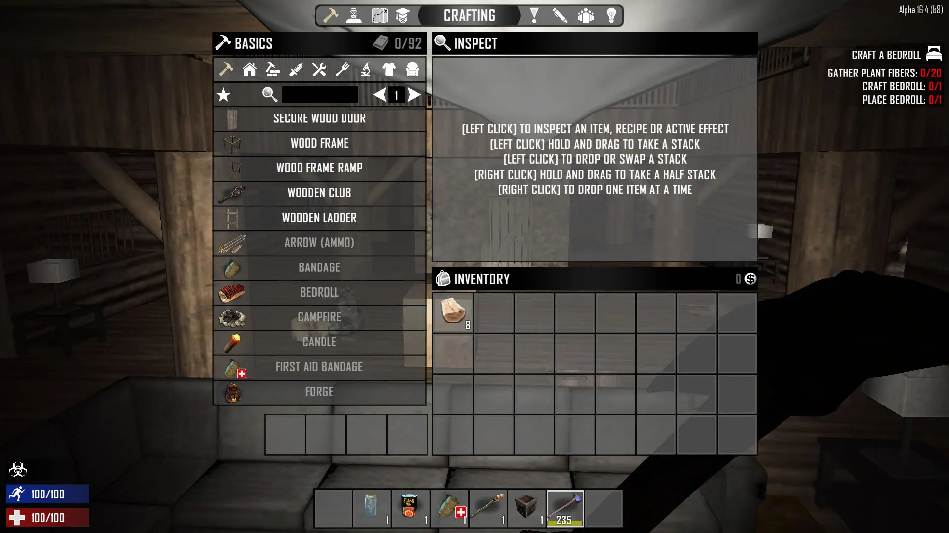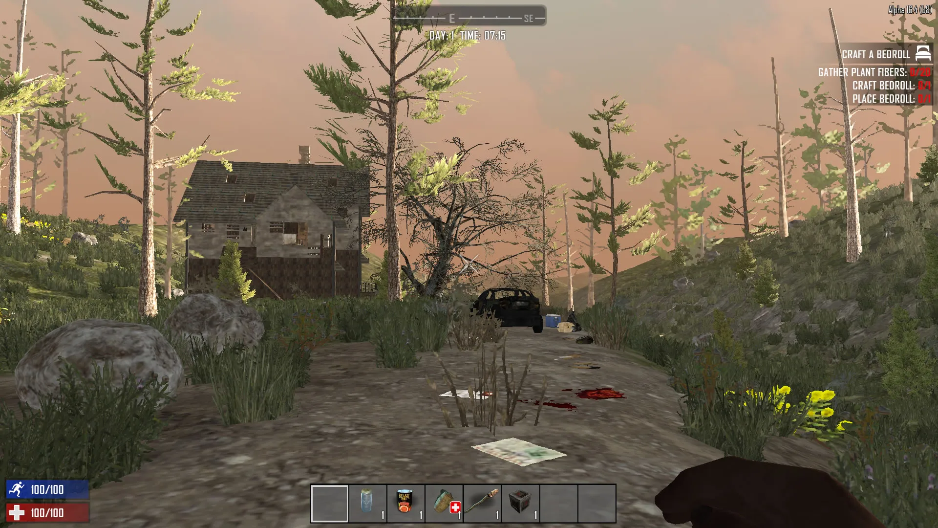 En este juego comenzamos con una lata de comida, un vaso de agua (si tendremos que preocuparnos mucho de obtener comida y bebida), una antorcha, … Poca cosa y tendremos que buscar todo en el mundo ya sea minando al estilo Minecraft o saqueando bolsas de basura, en los muebles de las casas, los coches averiados, etc.